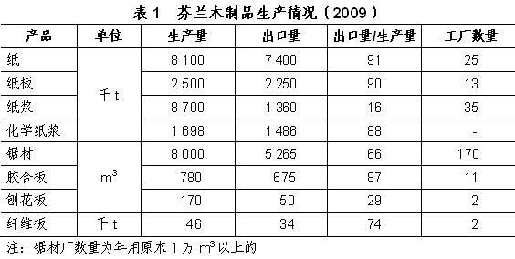 芬蘭紙和紙板的產(chǎn)量居世界第6位,針葉樹鋸材產(chǎn)量居世界第7位。2009年芬蘭有250多家木制品生產(chǎn)廠(表1),生產(chǎn)的大部分產(chǎn)品用于出口,大部分出口產(chǎn)品由數(shù)家大企業(yè)生產(chǎn)。特別是紙制品,2008年出口量的70%以上由5家企業(yè)生產(chǎn)。林產(chǎn)品主要向德國(guó)和英國(guó)等歐洲國(guó)家出口,占70%以上,對(duì)亞洲地區(qū)的出口占12%。