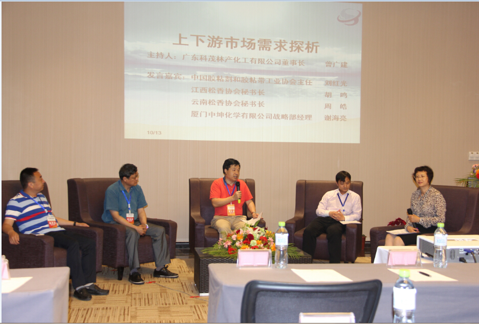 接下來是分論壇二《上下游市場需求探討》,由廣東科茂林產(chǎn)化工有限公司董事長曾廣建主持,中國膠粘劑和膠粘帶工業(yè)協(xié)會主任劉紅光、江西松香協(xié)會秘書長胡鳴、云南松香協(xié)會秘書長周皓、廈門中坤化學有限公司戰(zhàn)略部經(jīng)理謝海亮擔任發(fā)言嘉賓,他們就2016年上下游市場對松香/松節(jié)油及其深加工產(chǎn)品需求情況去分析、預判市場,讓參會代表看到了當前行業(yè)市場需求情況。最后主持人總結說:就市場需求,我們也不要太悲觀,今年松香市場也有利好因素,一是減產(chǎn)的預期;二是 “一帶一路”項目建設正在如火如荼進行中;三是國家多項政策擴大內外需求、提振經(jīng)濟;四是房地產(chǎn)多項舉措去庫存;這系列有利因素都將能帶動市場需求的。