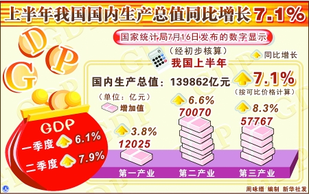 國家統(tǒng)計局數(shù)據(jù)顯示,二季度中國經(jīng)濟同比增長7.9%,增速比一季度加快1.8個百分點。這樣,上半年中國經(jīng)濟同比增長率達到7.1%。