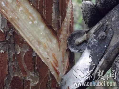 筆者現(xiàn)場看到,這些松樹皮被割開后,松脂就從“丫”字形傷口處一滴一滴地流了出來,酷似人掉眼淚一樣,看著就叫人心疼。”該村一位不愿意吐露姓名的村民著氣憤的說,該縣境內(nèi)各山區(qū)每年都有人割油,一年割4個月,連續(xù)割幾年,每天每棵樹可采集0.5斤樹脂,每斤樹脂賣6-8元錢。村民多次向有關部門反映均未果,割油人將這些松樹割皮挖溝采集油脂,松樹的營養(yǎng)成分也會流失掉,時間一長,這些好不容易成活的松樹可能會死亡。