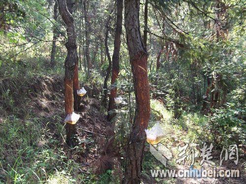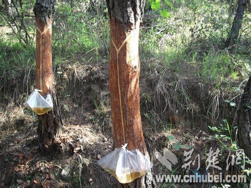筆者接到投訴后在前往羅田縣鳳山鎮(zhèn)石里鋪村的路兩邊看到,一些直徑約20厘米粗細的松樹,在距離地面不到半米處,有近20厘米長的皮被大片剝開。村民介紹:大片松樹自下而上挖開一條溝,溝的上部又挖開“丫”字形的兩條側溝,在溝下面掛上一只透明塑料袋,袋兩邊被竹釘緊緊釘在樹里,淌下的樹脂就流進這只塑料袋(如上圖)。