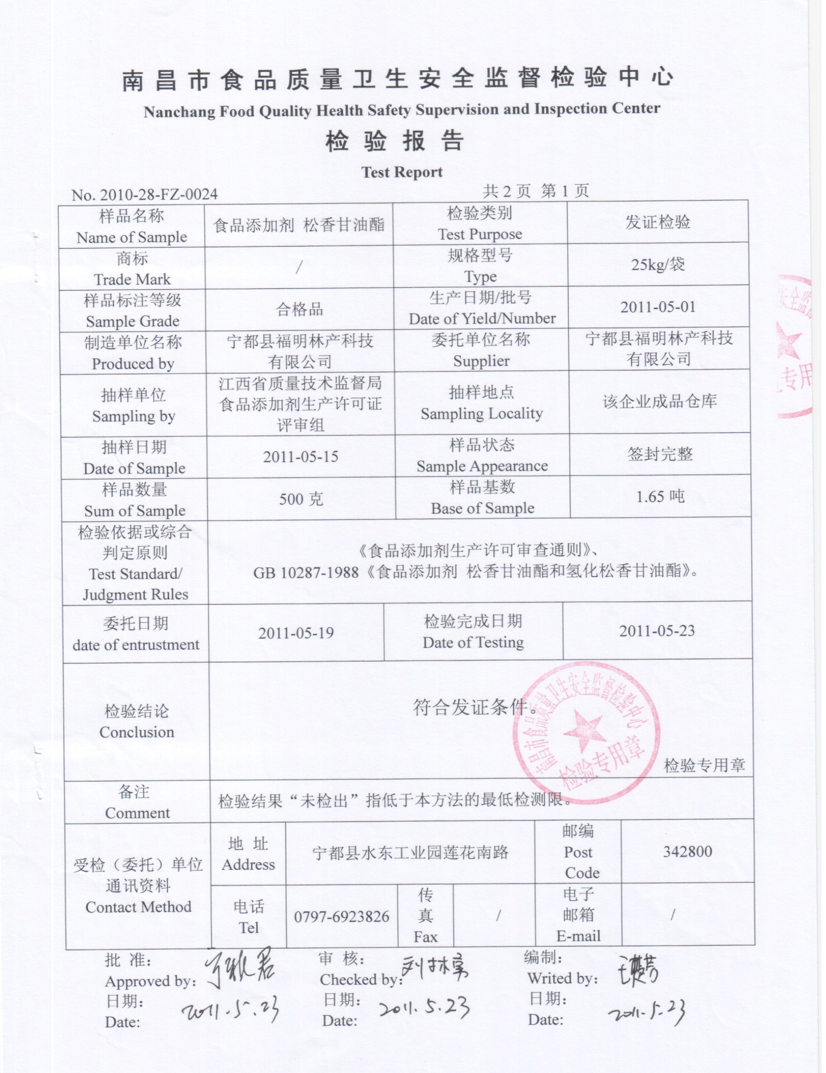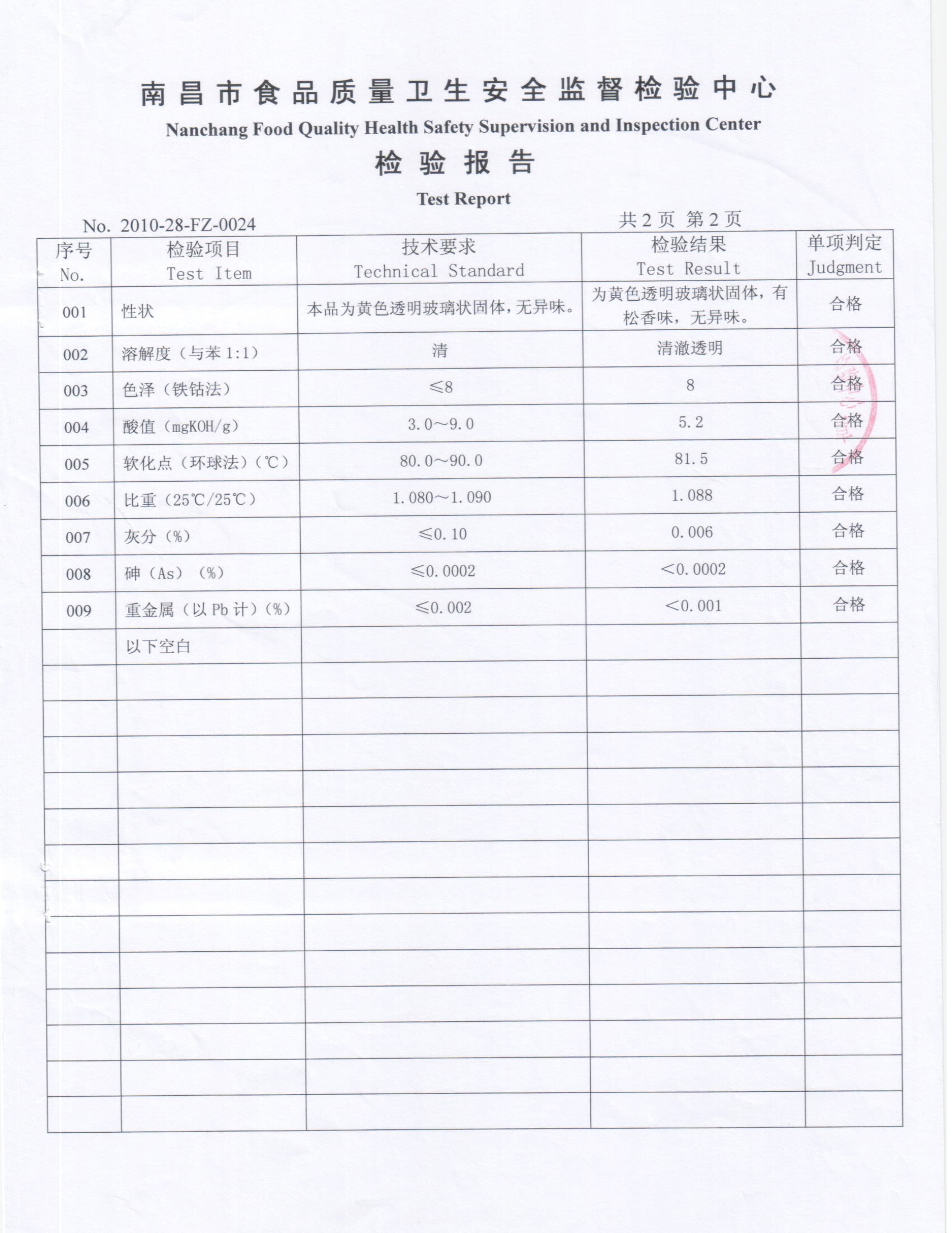 食品級松香甘油酯檢測報(bào)告(寧都福明)