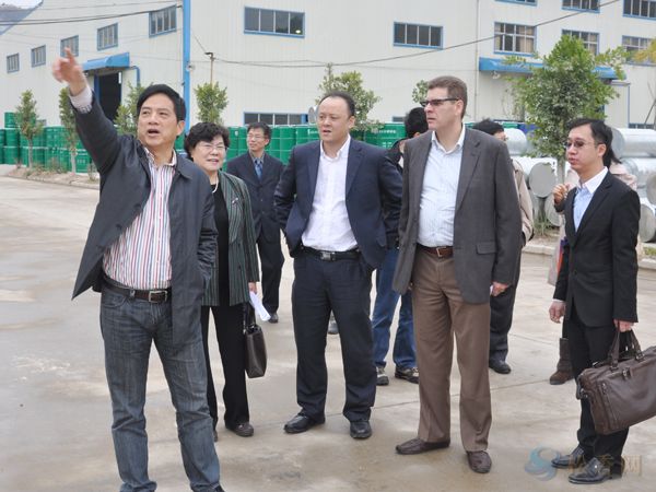 考察團在廠區(qū)考察。左三為亞太區(qū)生產(chǎn)總監(jiān)Ricardo、左二為大中華區(qū)銷售總監(jiān)姚健清,左一為總經(jīng)理車乾池,右一公司副總經(jīng)理全楚娃。