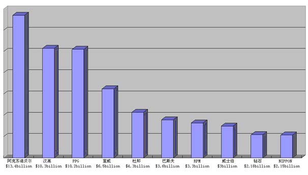 油漆涂料頂級品牌公司整合并購加劇,并加速亞洲市場的開發(fā),尤其是中國市場,阿克蘇諾貝爾牢牢占據(jù)領(lǐng)先位置,居全球的第1,得益于收購帝國化學(xué)ICI,雖然在出售了英國涂料公司王冠crown。PPG收購式馬卡龍進一步鞏固了市場地位。RPM加大內(nèi)部品牌整合力度。鉆石涂料在收購四季涂料和弗羅斯特涂料,排名躍居世界的第9。世界十大油漆涂料品牌公司排名:表1