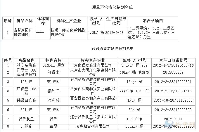 日前,天津市工商局在流通領(lǐng)域?qū)?biāo)稱河南、河北、遼寧、陜西、廣東、天津等6個(gè)省、直轄市8家企業(yè)生產(chǎn)的9個(gè)批次膠粘劑開展質(zhì)量監(jiān)測(cè)。依據(jù)GB18583-2008《室內(nèi)裝飾裝修材料膠粘劑中有害物質(zhì)限量》、JC/T438-2006《水溶性聚乙烯醇建筑膠粘劑》及經(jīng)備案現(xiàn)行有效的商品明示企業(yè)標(biāo)準(zhǔn),重點(diǎn)檢測(cè)了溶劑型膠粘劑的外觀、剪切強(qiáng)度、不揮發(fā)物含量、黏度、粘度、異氰酸酯基含量、初粘剪切強(qiáng)度、初粘剝離強(qiáng)度、剝離強(qiáng)度、游離甲醛、苯、甲苯+二甲苯、甲苯二異氰酸酯、(二氯甲烷、1,2-二氯乙烷、1,1,2-三氯乙烷、三氯乙烯)總量、總揮發(fā)性有機(jī)物等15項(xiàng)指標(biāo);水基型膠粘劑的外觀、pH值、黏度、不揮發(fā)物、最低成膜溫度、木材污染性、壓縮剪切強(qiáng)度、粘結(jié)強(qiáng)度、低溫穩(wěn)定性、游離甲醛、苯、甲苯+二甲苯、總揮發(fā)性有機(jī)物等13項(xiàng)指標(biāo)。主要問(wèn)題是1個(gè)批次溶劑型膠粘劑(二氯甲烷、1,2-二氯乙烷、1,1,2-三氯乙烷、三氯乙烯)總量指標(biāo)不合格。