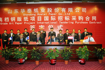 6月17日,華泰紙業(yè)45萬(wàn)噸高檔銅版紙項(xiàng)目國(guó)際招標(biāo)采購(gòu)合同簽字儀式在華泰工業(yè)園舉行。東營(yíng)市市委常委、廣饒縣縣委書記趙豪志,縣長(zhǎng)田和友,市經(jīng)貿(mào)委副主任龍艦,縣委常委、大王鎮(zhèn)黨委書記楊同賢等政府領(lǐng)導(dǎo),集團(tuán)董事長(zhǎng)李建華,以及中標(biāo)單位美卓造紙與紙漿總裁Bertel、安德里茲亞洲區(qū)副總裁Gary、ABB亞太區(qū)域銷售經(jīng)理Jean—christophe bussolaro、長(zhǎng)沙長(zhǎng)泰輸送包裝設(shè)備有限公司總經(jīng)理簡(jiǎn)澤豐等出席簽字儀式。儀式由山東齊信招標(biāo)公司趙欽軍經(jīng)理主持。