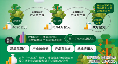 數(shù)字顯示,全國(guó)林業(yè)產(chǎn)業(yè)總產(chǎn)值已由2001年的4090億元增加到2015年的5.94萬(wàn)億元,15年間增長(zhǎng)了13.5倍,我國(guó)已成為世界上林業(yè)產(chǎn)業(yè)發(fā)展最快的國(guó)家和世界林產(chǎn)品生產(chǎn)、貿(mào)易、消費(fèi)第一大國(guó)。