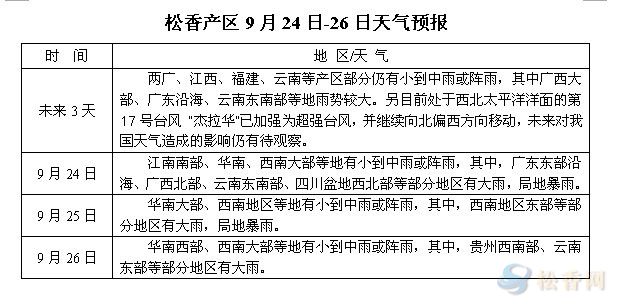 華訊松香網(wǎng)溫馨提醒:未來三日,桂粵閩贛滇等大部地區(qū)將迎來小到中雨或陣雨,局部地區(qū)雨勢較大。另受南下冷空氣及臺風(fēng)“杰拉華”共同影響,部分沿海地區(qū)或?qū)⒂瓉泶箫L(fēng)降溫天氣。隨著季節(jié)深入,各產(chǎn)區(qū)晝夜溫差將有所加大,加上部分地區(qū)降雨天氣的影響,采脂工人的上山或有所受阻。脂價方面,今日廣西、云南局部脂價略有上調(diào),但部分松脂供應(yīng)商卻因此而滋生惜售心理,綜上,預(yù)計(jì)本周松脂量或難明顯放大。