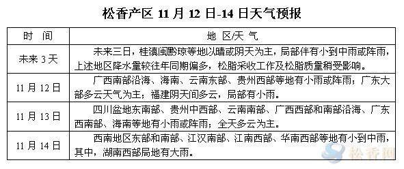 華訊松香網(wǎng)溫馨提醒:未來三日,桂滇閩黔瓊等地以晴或陰天為主,局部伴有小到中雨或陣雨,上述地區(qū)降水量較往年同期偏多,松脂采收工作及松脂質量稍受影響。本周,江西、福建等地最后一批松脂或能繼續(xù)釋放,兩廣等地產(chǎn)區(qū)或維持上周緩慢流出狀態(tài),云南地區(qū)采脂工積極性仍不高,或難以有效放大。