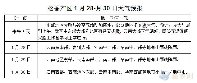 華訊松香網(wǎng)提醒:未來三天各產區(qū)無明顯冷空氣活動和降水,部分地區(qū)多霧霾天氣。其中云南大部天氣晴好,局部氣溫偏低,采脂工作基本可正常進行。除云南外的其他產區(qū)均已停止收脂工作,云南地區(qū)松脂量持續(xù)偏少,上周末部分接有訂單的工廠小幅上調價格以保證原料供應。據(jù)悉,本周云南采脂工人將陸續(xù)放假下山,并因區(qū)域風俗不同,大部分地區(qū)春節(jié)假期將持續(xù)近一個月,預計到3月中下旬才有新一批的松脂下山。