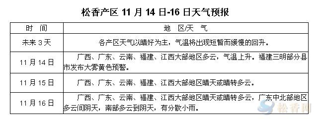 華訊松香網(wǎng)提醒:未來三天,各松香產(chǎn)區(qū)天氣以晴好為主,氣溫將出現(xiàn)短暫而緩慢的回升。兩廣、江西、福建等產(chǎn)區(qū)產(chǎn)季接近尾聲,晴好天氣利于松脂采收和運(yùn)輸,隨著最后一批松脂陸續(xù)出來,工廠可持續(xù)正常收脂。