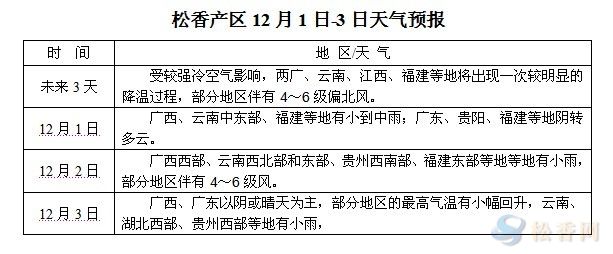 華訊松香網(wǎng)提醒:受較強冷空氣影響,未來三天,各產(chǎn)區(qū)均不同程度的降溫。福建、江西采脂進入收尾階段,兩廣地區(qū)也進入產(chǎn)季尾期,正陸續(xù)上山采脂的脂農(nóng)請注意氣溫下降對出脂的影響,以及大風對松脂質量的影響,合理安排采收。