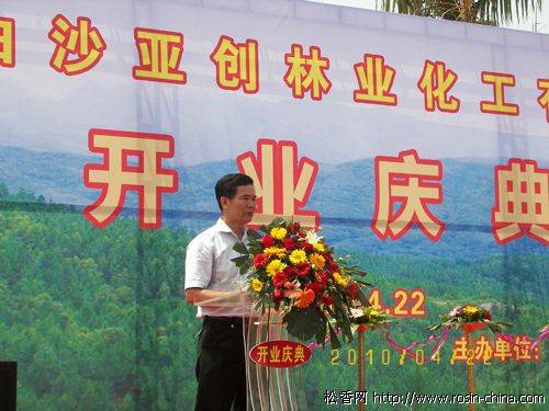 2010年4月22日上午,海南白沙亞創(chuàng)林業(yè)化工有限公司海南白沙松香廠舉行開業(yè)慶典。劉偉董事長(zhǎng)代表海南五指山集團(tuán)有限公司、海南亞創(chuàng)林業(yè)股份有限公司致祝辭,所在白沙縣委常委、副縣長(zhǎng)倪陳興代表白沙縣委、縣政府,海南省工商聯(lián)秘書長(zhǎng)梁生彬代表省工商聯(lián)、省光彩事業(yè)促進(jìn)會(huì),分別發(fā)表了重要講話。在隆隆的禮炮聲中,白沙縣委書記嚴(yán)正宣布白沙松香廠建成正式投產(chǎn)。