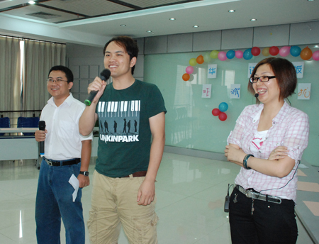 本期華訊版“非誠(chéng)勿擾”以“卡拉OK ”接歌賽+趣味競(jìng)技+“非誠(chéng)勿擾”的三合一模式開(kāi)展,分三個(gè)環(huán)節(jié)進(jìn)行。節(jié)目開(kāi)始前,全體員工先分為三組,分別設(shè)定“口號(hào)”,第一組“沒(méi)有你做不到,只有你想不到”;第二組“紅燈亮到底”;第三組“放眼全球我最棒”, 響亮的口號(hào)喊出了每人心中的激動(dòng)與渴望?;顒?dòng)由松香網(wǎng)仇志利與淀粉網(wǎng)劉峰聯(lián)袂主持。