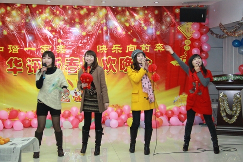 四位青春靚麗的女孩用一首《快樂你懂的》,拉開了2011華訊新春聯(lián)歡晚會的序幕,動感活潑,激情四射。晚會以“和諧一家親,快樂向前奔”為主題,有小品、獨唱、合唱、舞蹈、啞劇等各式各樣的節(jié)目。其中小品《非雷勿擾》與其強大的陣容、幽默詼諧的語言、精彩的反串,贏得了大家的喜愛;而客服部的幾個漂亮女孩以一個具有中國古典風的舞蹈《扇變》,讓人跟前一亮;程曄的一曲《穆桂英掛帥》,則盡顯英姿颯爽。