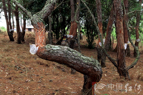 一陣山風(fēng)吹過(guò),山野的松林“沙沙”作響,如泣似訴。凡有松樹(shù)處,無(wú)論粗細(xì)高矮,都難逃剝皮厄運(yùn)。那些松樹(shù)的樹(shù)干,無(wú)一例外地被剝?nèi)?shù)皮,并割出“Y”字形刀口,“Y”字底部都有一個(gè)塑料袋,用于裝載汩汩滲出的松脂。